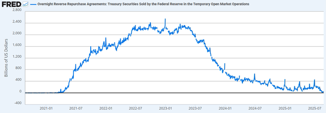 作为公开市场操作的一部分,美联储维持着隔夜逆回购工具(RRP),这是一个非银行实体存放现金以换取美联储设定的利率的地方。该机制允许美联储设定短期借贷利率的下限,而这一利率由货币政策决定。
