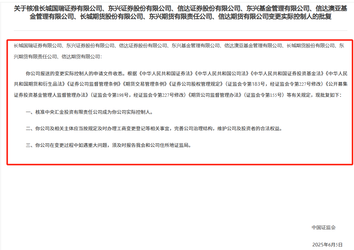 6月6日,证监会披露,长城国瑞证券、东兴证券、信达证券、东兴基金、信达澳亚基金、长城期货、东兴期货、信达期货变更实控人申请获核准,中央汇金成为上述8家公司实控人,上述公司需按规定及时办理工商变更登记等相关事宜,完善公司治理结构,维护公司及投资者合法权益。