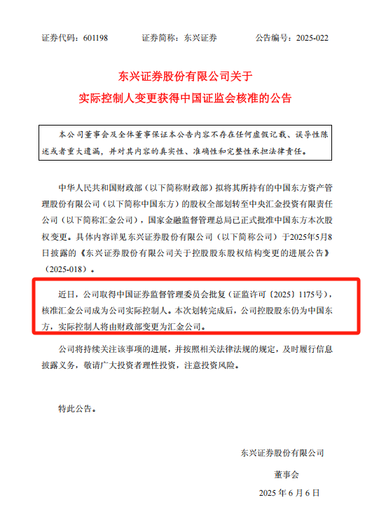 东兴证券也发布公告表明,近日,公司取得证监会批复,核准汇金公司成为公司实控人。本次划转完成后,公司控股股东仍为中国东方,实控人将由财政部变更为汇金公司。
