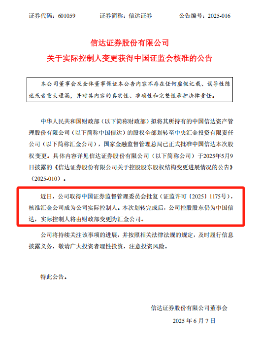 信达证券同日公告称,近日,公司取得证监会批复,核准汇金公司成为公司实控人。本次划转完成后,公司控股股东仍为中国信达,实控人将由财政部变更为汇金公司。