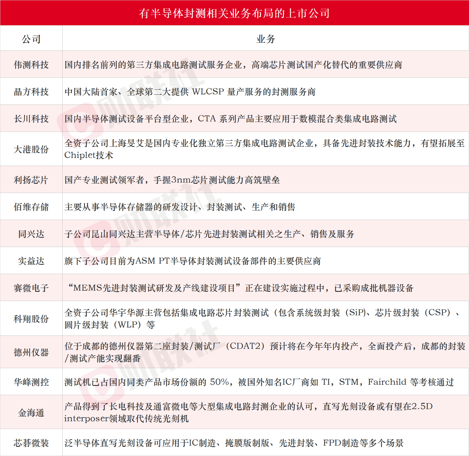 除了长电科技、通富微电、华天科技、智路封测外,上市公司中布局半导体封测领域的还有伟测科技、晶方科技、长川科技、大港股份、利扬芯片、佰维存储、同兴达、实益达、赛微电子、科翔股份、德州仪器、华峰测控、金海通、芯碁微装等。