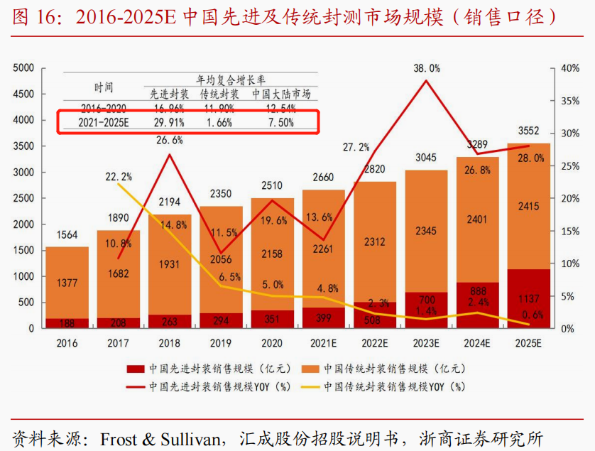 据Frost & Sullivan数据预测,中国大陆封测市场2021-2025E CAGR 约为7.5%,2025年市场规模将达到3552亿元,占全球封测市场约为75.6%。其中,中国大陆先进封装市场增长迅速,2021-2025E CAGR约为29.9%,预计2025年中国先进封装市场规模为1137亿元,占比中国大陆封装市场约为32.0%。