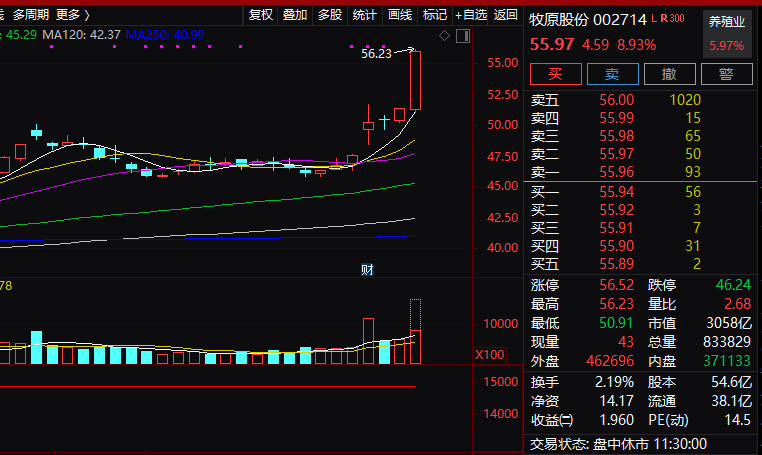 概念板块方面,猪肉概念股集体大涨,傲农生物放量涨停,市值超3000亿元的牧原股份涨近9%,立华股份、京基智农、天康生物等涨幅居前。