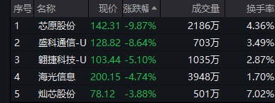 万得芯片概念指数盘中跌幅一度超过1.6%。截至中午收盘,万得芯片概念指数成份股中,芯原股份跌近10%,盛科通信-U跌超8%;寒武纪-U、海光信息盘中跌幅一度超过5%。