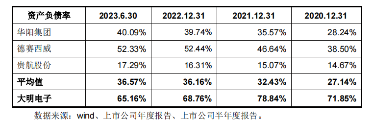 数据显示,2019年-2023年上半年,大明电子的资产负债率分别为75.5%、71.85%、78.84%、68.76%、65.16%,远超同行30%左右的平均水平。尤其是2021年,大明电子的负债率一度达到78.84%,如此高杠杆运行,不知道的还以为公司是做房地产的。