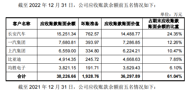 根据招股书,大明电子的客户集中度较高,主要都是一汽、比亚迪这样大车企。前5大客户占当期收入的比例常年维持在70%左右。而财报显示,公司应收账款余额前五名,占总应收账款的比例,每年只有60%左右。