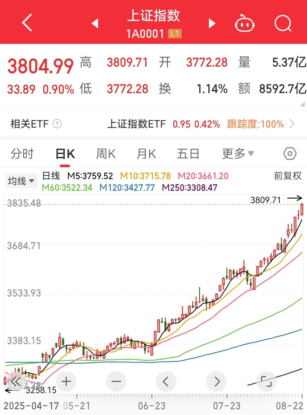 截至8月22日13:56,A股市场合计成交额达到2万亿元以上,连续8日(8月13日~22日)突破2万亿元,打破A股历史纪录。此前的2024年11月5日~13日,A股市场成交额曾连续7日达到2万亿元以上。