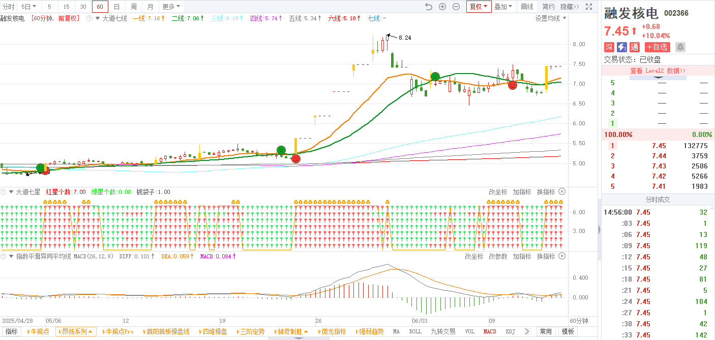 3)参考技术指标:融发核电-大道七线-日线1号和2号线多头排列,且60分K线出现笑脸信号。