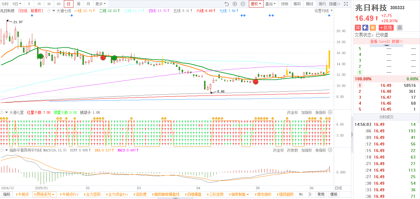 3)兆日科技-大道七线-日线出现笑脸信号,且大道七星全红。
