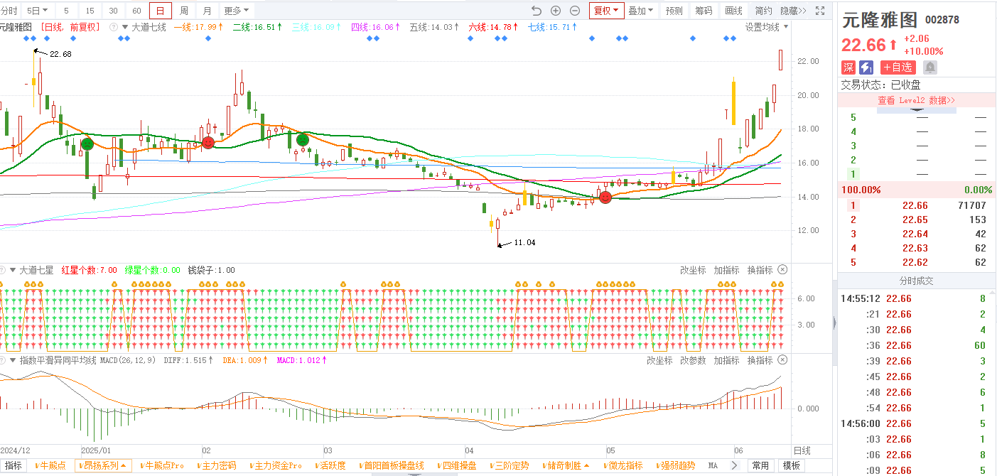 3)参考技术指标:元隆雅图-大道七线-日线1号线和2号线多头排列,且大道七星全红。