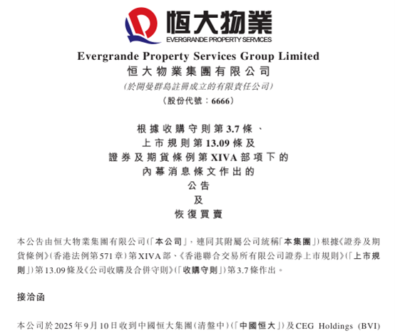 9月11日晚间,恒大物业披露停牌内幕消息,即该公司于2025年9月10日收到中国恒大集团及CEG Holdings的共同及个别清盘人发出的接洽函。