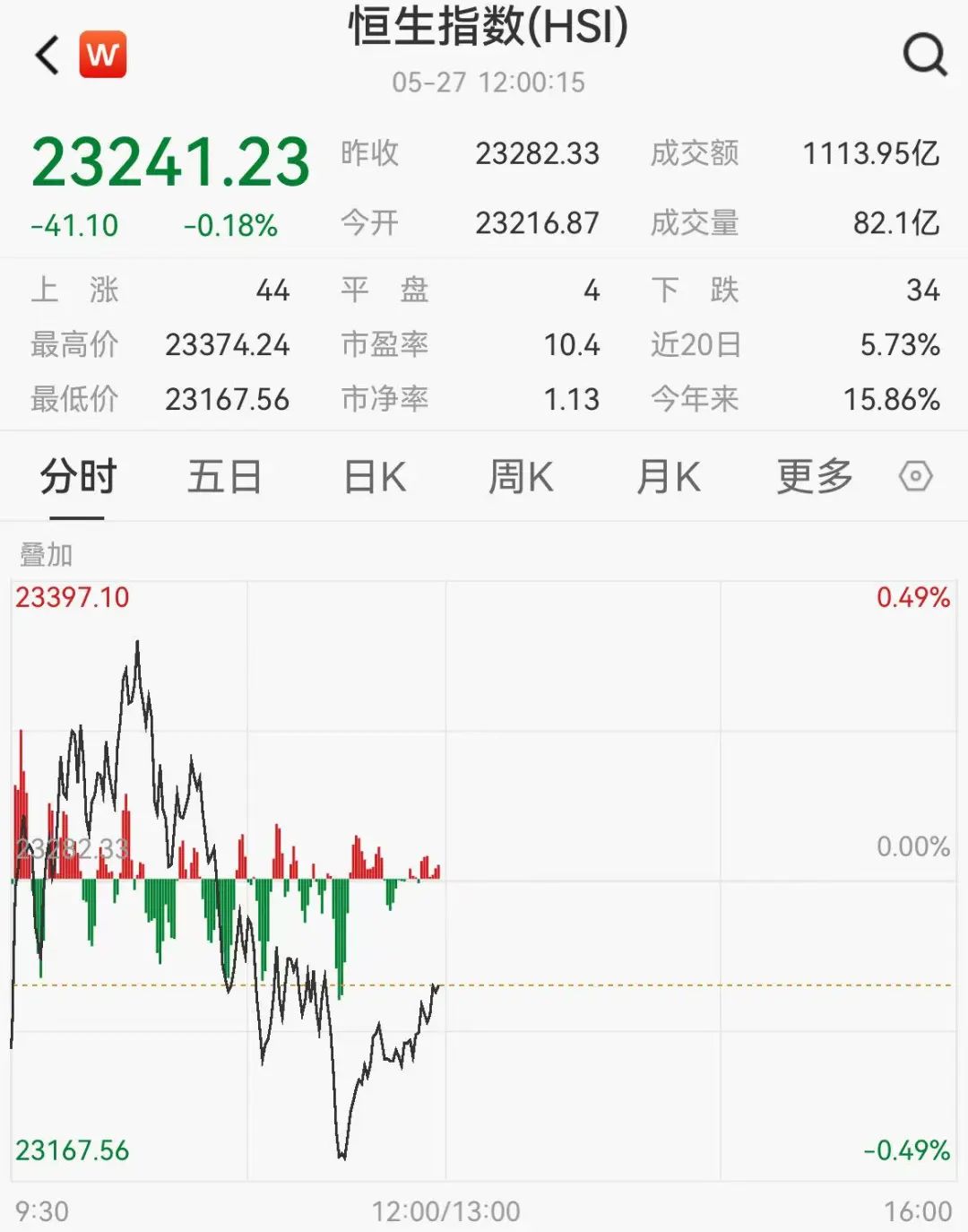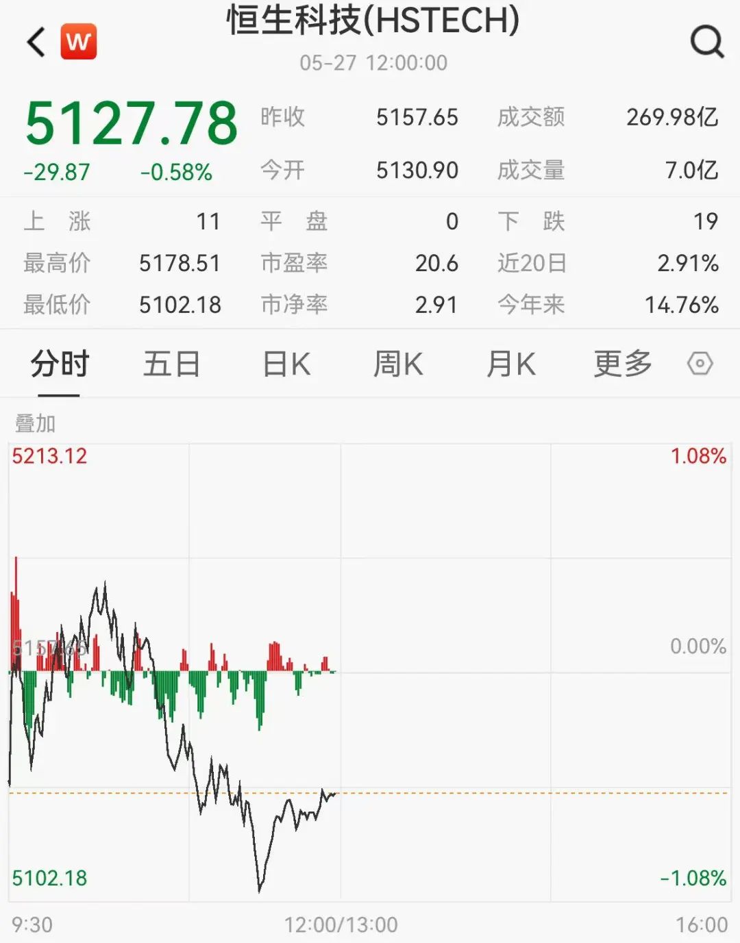 港股市场方面,截至午间收盘,恒生指数跌0.18%,恒生科技指数跌0.58%。