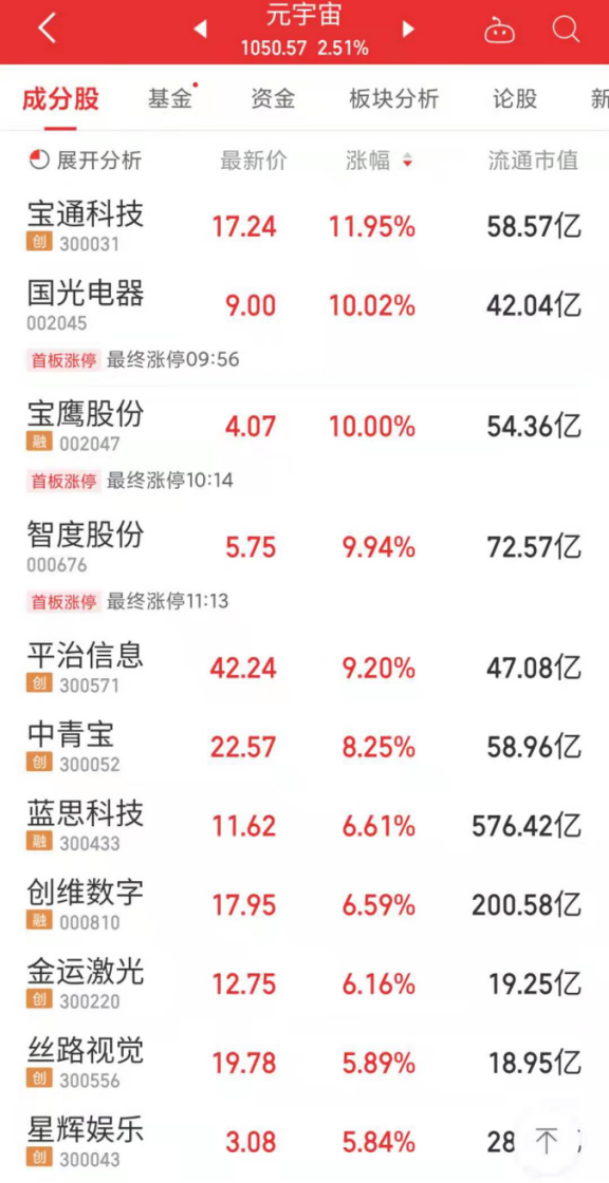 元宇宙概念板块异动拉升,宝通科技涨近12%,宝鹰股份、国光电器涨停,中青宝、蓝思科技跟涨。