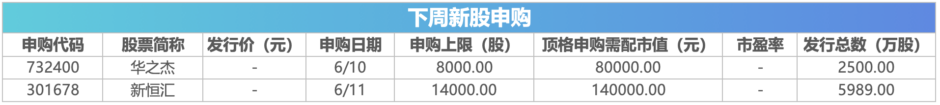 Wind数据显示,下周将有2只新股发行,沪市主板有1只,创业板有1只,合计发行约8488.89万股,预计合计募资11.26亿元。具体来看,6月10日发行的是华之杰;6月11日发行的是新恒汇。