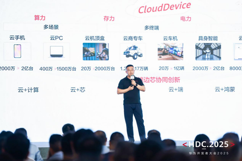 6月21日,华为云CloudDevice“云启万物·智联未来”高峰论坛在华为开发者大会HDC2025期间举办,峰会上首发了CloudDevice全系列产品,涵盖了云手机、云PC、云Pad、云空间、云游戏、云机顶盒、云车机等产品。