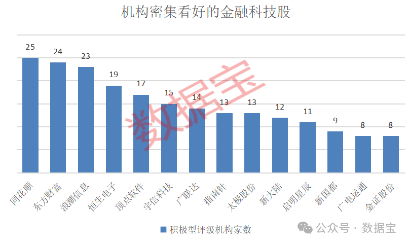 据证券时报·数据宝统计,A股金融科技板块中,有14股获8家及以上机构积极型评级。其中,金正股份和宇信科技在2024年年报披露后,获券商出具了包含“金融科技”的业绩点评分析报告。