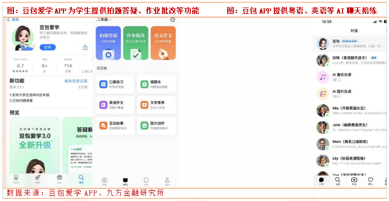 2024 年 9 月字节推出基于豆包大模型的AI教育应用——豆包爱学,为学生提供个性化学习支持。字节跳动大力教育旗下的AI教育App河马爱学,已正式更名为 “豆包爱学”,通过拍照搜题、AI讲解、作业批改和作文指导等功能,豆包爱学帮助学生高效解决学习难题、提升写作能力,关注学生的情感需求,简化使用门槛,特别适合低龄学生。