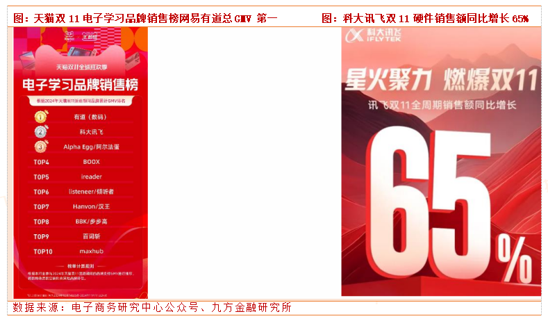 前三季度我国学习机线上销售额同比大增 51.7%。双十一期间,网易有道、科大讯飞、作业帮增速表现亮眼。网易有道在京东天猫双平台稳居行业销额第一,创下了连续五年行业第一的战绩。科大讯飞学习机全渠道销售额同比增长超100%,硬件全渠道销售额同比增长65%;作业帮学习机销量同比增长263%,全网销量行业第一。