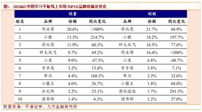 销量来看,教培企业优势显著,作业帮占据销量榜首,学而思占据销额榜首。24Q3作业帮首次占据了线上市场销量第一的位置,主要受2000元价位档的P20机型带动;小猿和学而思分别占据销量第二和第三的位置。销额方面,学而思因产品单价更高占据第一的位置,4000元以上产品占据了学而思内部销量的90%。