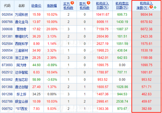 2)龙虎榜机构动向:11月14日,机构参与龙虎榜中个股共涉及22股,其中14股被机构净买入,万润科技被买入最多,为9804.94万元。