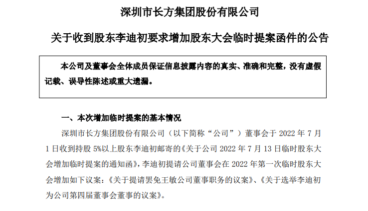7月3日晚间,*ST长方公告,公司持股5%以上股东李迪初提请公司董事会在2022年第一次临时股东大会增加《关于提请罢免王敏公司董事职务的议案》《关于选举李迪初为公司第四届董事会董事的议案》。