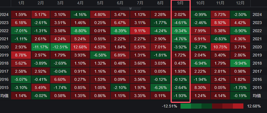 财联社周末曾介绍过,美国银行分析师Paul Ciana援引可追溯至1927年的数据显示,标普500指数在9月下跌概率高达56%,平均跌幅为1.17%。而在过去十年里(2015年-2024年),标普500指数有六次在9月出现下跌,平均跌幅为1.93%,为历月最遭,其中更是存在如2022年9月单月暴跌9.34%的“凄惨”案例。