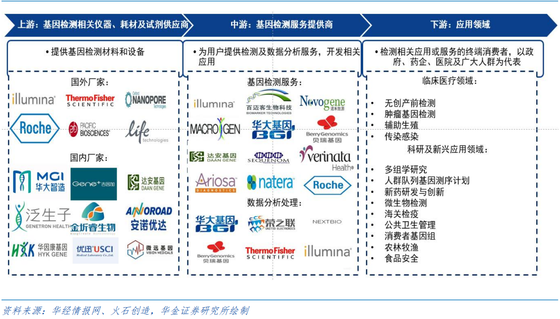 基因检测产业链分为上中下游三部分: