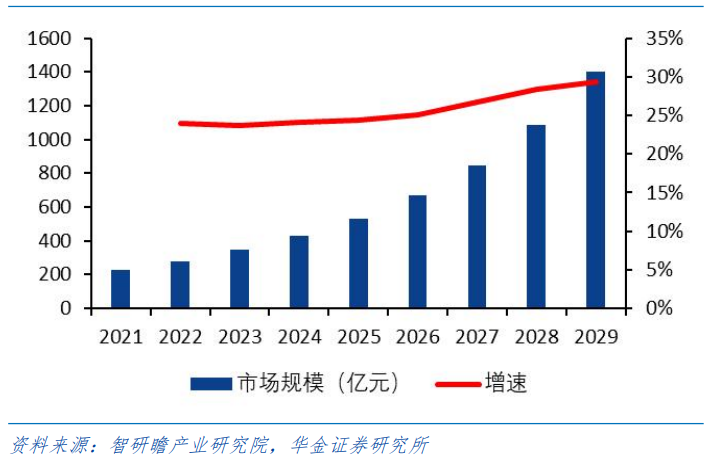 ②有望催生出多个百亿级甚至千亿级的应用市场,全产业链市场增量可期,预计2029年将达到1042亿元,2021年至2029年的年复合增长率为26%。