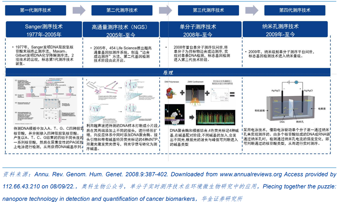 基因测序技术推动了包括基因组、转录组、蛋白质组、代谢组学在内的多组学研究加速发展。测序平台伴随着测序技术的发展而发展。当前,测序技术经历了Sanger测序技术、NGS测序技术和单分子测序技术的变革。基因测序仪的技术壁垒比较高,国内量产企业只有华大集团的华大智造,其他厂商主要和Illumina、Thermo Fisher以及华大智造联合开发。从产品成熟度、市场占有率以及转化应用来看,NGS是目前市场的主流测序平台。