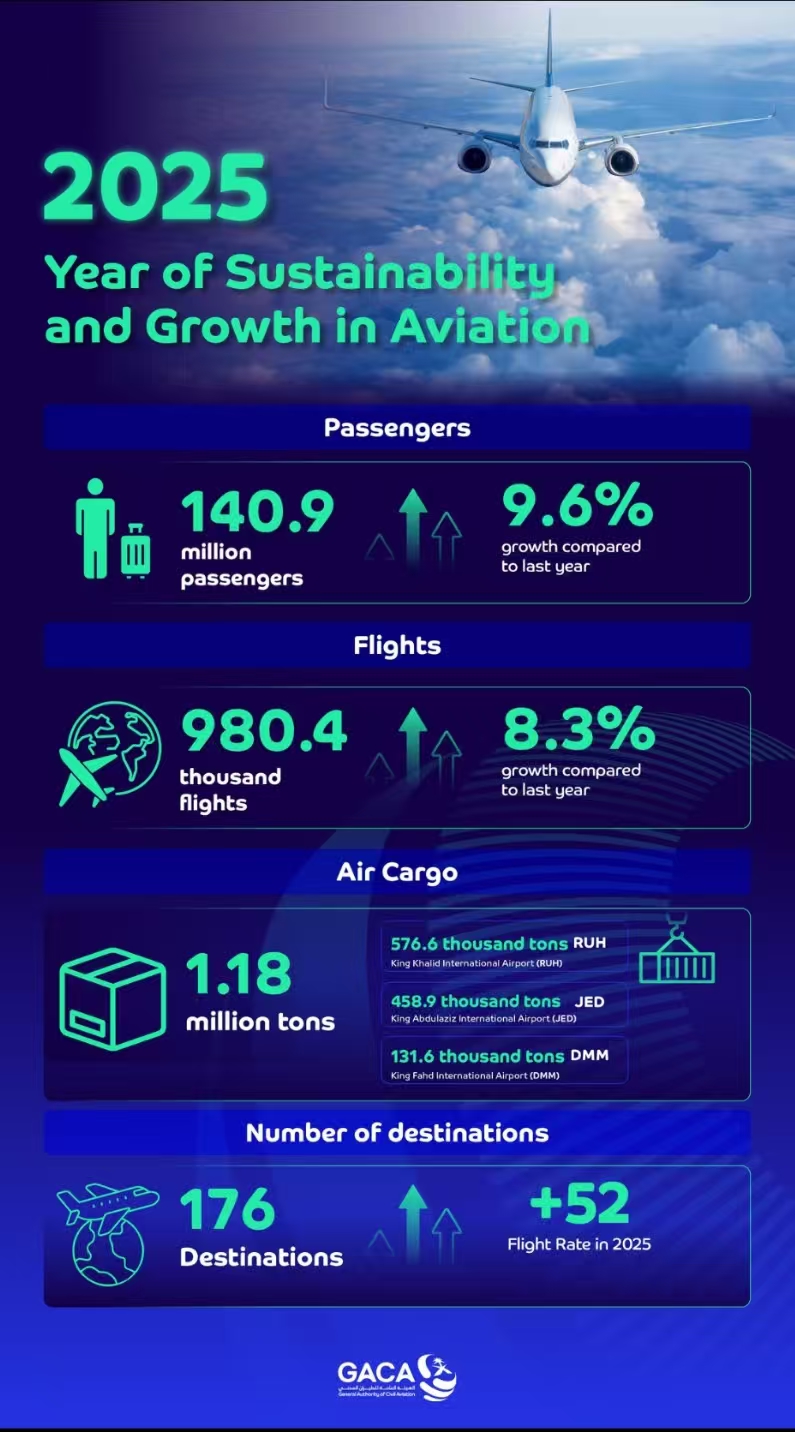 根据沙特民航总局(GACA)的数据,2025年沙特民航客运量增长明显,全年超过1.4亿人次,较去年同期增长约9%。