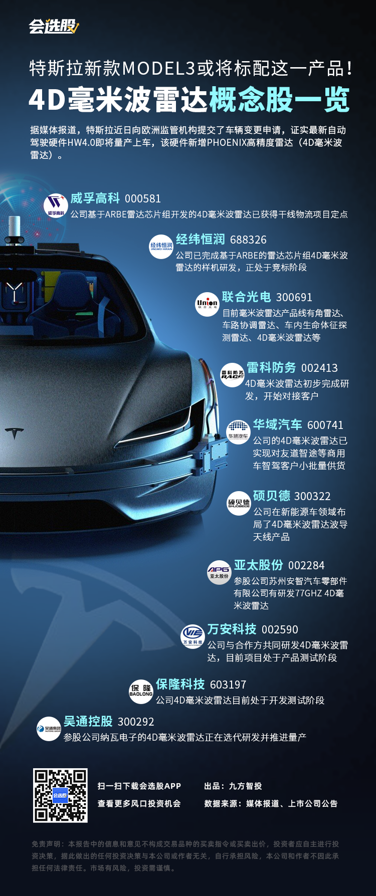 图说A股|特斯拉MODEL3标配!4D毫米波雷达概念股一览