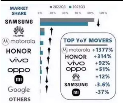中国市场:据IDC,2023Q3中国市场折叠机出货量YOY+90.4%,QOQ+56.4%,同比、环比双增长;CINNO统计,中国市场已连续第十二个季度同比正增长。其中2023年前三季度华为以31.7%的市场份额稳居第一,OPPO、荣耀、Vivo份额快速提升,加速追赶。市场已经从“一枝独秀”进入“百家争鸣”的时代,2024年中国折叠机市场的差异化竞争之战料将愈发激烈。