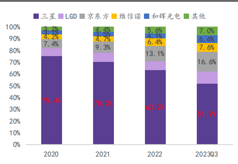 中国OLED产能快速释放,市占率提升显著。中国面板厂商持续的资本开支助力OLED产能快速提升,逐步缩小与韩国大厂的差距。产能释放、产品力提升推动终端品牌 加大国产化导入力度,大陆OLED面板厂出货量保持快速增长,2023Q3出货7340万片,YOY+75.0%,占全球市场份额44.3%,持续挑战三星SDC龙头地位。
