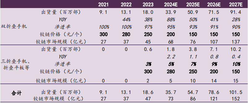 在折叠机轻薄化趋势下,轻量化、高强度的铰链材料以及复杂精密的 加工、组装工艺将推动铰链材料成本和加工成本不断攀升。在铰链单机价值量不断提升叠加折叠 机持续放量的带动下,经测算我们预计2023年全球折叠机铰链市场规模将超过47亿元,2023- 2027年CAGR高达34%,市场空间广阔。