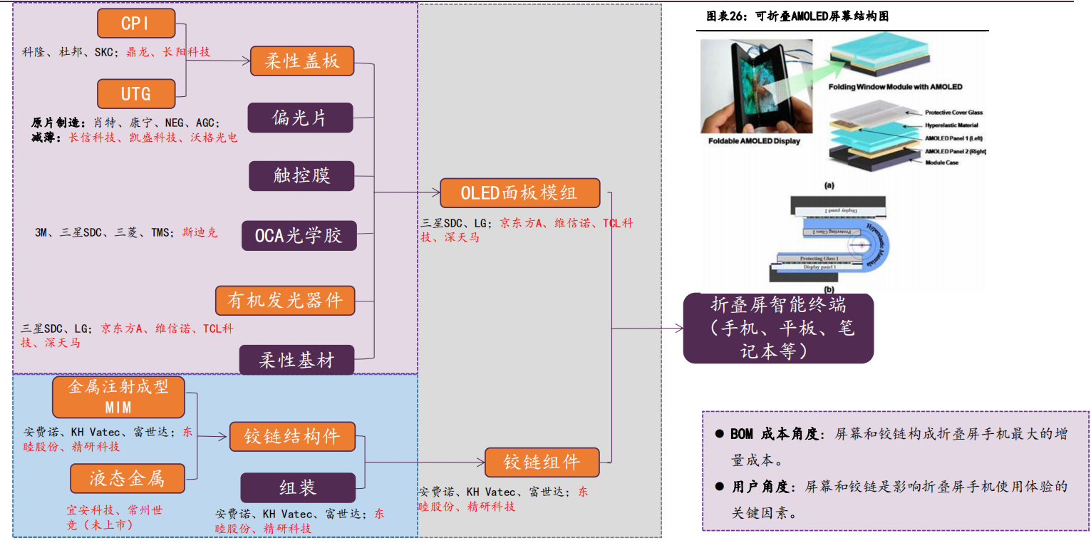 华鑫证券在研报中指出,折叠屏手机是全球手机市场中唯一的增长细分赛道,终端品牌商大力推动下渗透加速,市场爆发在即。产品实现轻薄化叠加价格下探是市场爆发的内在因素。铰链和屏幕构成折叠机BOM最大增量成本,产业链新增组件受益最大。其中水滴型铰链结构符合轻量化趋势渐成主流,折叠屏是OLED趋势性创新方向,盖板是柔性屏实现可折叠的关键,UTG有望成为首选盖板用材。