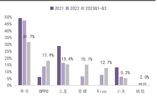 据Techinsights,2023Q3全球折叠机出货量同比+10%,其中亚太地区是出货量增长的领导者,中国是最大的单体市场。随着中国品牌的崛起,三星折叠机 延续下滑趋势,出货量YOY-3.6%,市场份额持续萎缩,全面领先的时代基本结束。以华为为首的国内厂商加速进军折叠机市场,市占率快速上升。