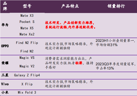 大折叠:与直板机形成双旗舰格局。华为、OPPO、VIVO、小米定位影像、系统、应用等“全面性能”商务旗舰机;荣耀侧重“轻薄化”旗舰配置 。