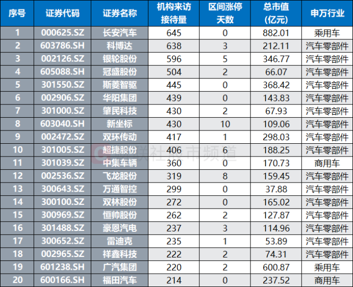 对于可关注标的方面,筛选汽车、汽车零部件相关概念股,长安汽车、科博达、银轮股份、冠盛股份、斯菱智驱、华阳集团、肇民科技、新坐标、双环传动、超捷股份等股近1年机构调研量居前。若统计股价活跃度情况,天普股份、ST八菱、山子高科、成飞集成、海马汽车、万向钱潮、日盈电子、湖南天雁、海联金汇等股近1年涨停次数较多。