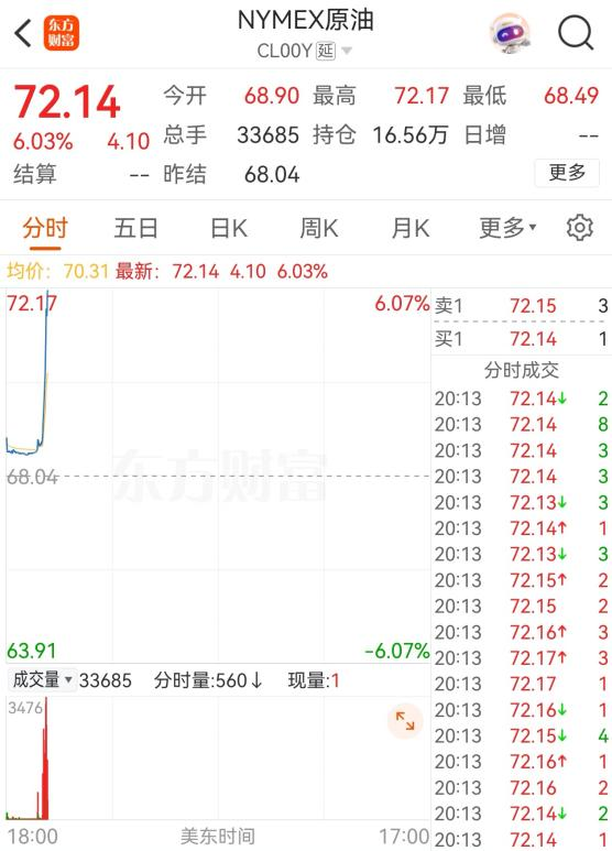随后,国际油价直线拉升,WTI原油期货涨幅扩大至6%;现货黄金也大幅拉升,目前涨超0.7%,价格突破3400美元/盎司。