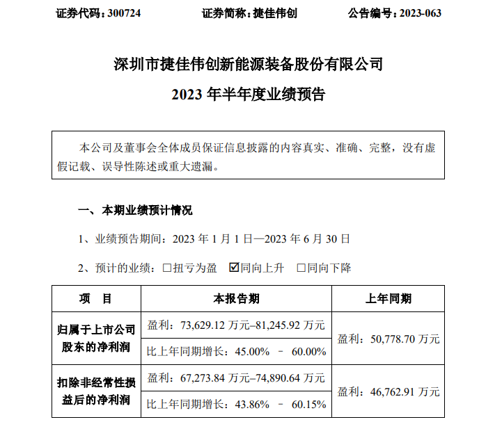 无独有偶,光伏电池设备供应商捷佳伟创(300724)当晚也公告称,公司预计上半年净利润为7.36亿元–8.12亿元,同比增长45%–60%。业绩增长主要系市场行情较好,公司产品市场需求良好,从而促进销售订单增长,销售收入上升;软件产品增值税即征即退收益增加。