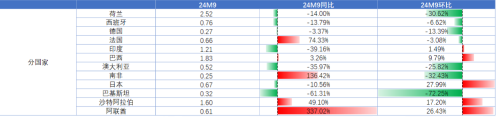 2024年9月国内出口荷兰光伏组件约2.52W,环比-30.62%,出口西班牙0.76GW,环比-6.62%,出口国0.27GW,环比-13.39%,前置仓国家与主力市场的表现反馈装机需求趋弱所带来的出口负反馈。印度、巴西市场受贸易政策影响,出口量与出口产品结构逐月波动变化,今年以来光储需求表现活跃的巴基斯坦在当地电价变化预期、外汇吃紧等因素下出现熄火,9月国内出口巴基斯坦组件0.32GW,同比/环比-61.31%/-72.25%,中东整体高速增长势头延续,联酋、沙特阿拉伯继续同比维持可观高增速,当地对能源转型的坚定推动使单月GW级的出口规模也有望逐步稳定。