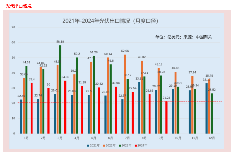 近日,中国海关公布2024年9月份进出口数据,出口硅片1.10亿美元、电池片1.62亿美元,光伏组件18.53亿美元三项,合计21.24亿美元,环比8月下降17.83%,创近4年来的月度新低。