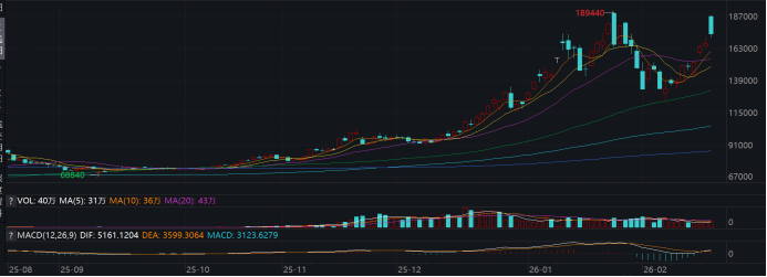 行情数据显示,碳酸锂期货主力合约(LC2605)自2月初低点以来加速反弹,连续突破14万元、15万元、16万元、17万元、18万元大关,截至今日盘中,月内最大涨幅已超过35%。今日LC2605合约早间以187,000元/吨大幅高开,盘中最高触及187,700元/吨;截至收盘,合约报价173,660元/吨,较上一交易日上涨5,820元,涨幅3.47%,日内振幅近9%。