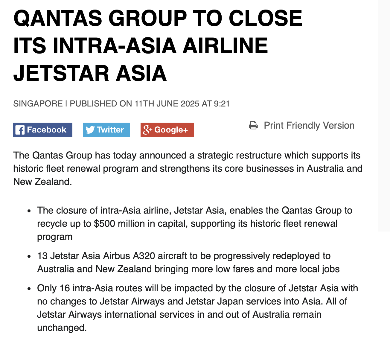 6月11日,澳航集团宣布,将关闭旗下低成本子公司捷星亚洲航空,公司的航班将陆续减少,并在7月31日正式结束营业。