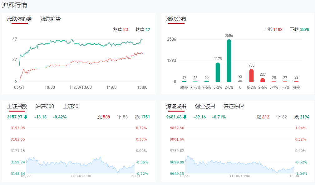 市场全天震荡调整,创业板指领跌。截至收盘,沪指跌0.42%,深成指跌0.71%,创业板指跌0.77%。总体上个股跌多涨少,全市场超4000只个股下跌。沪深两市今日成交额7993亿,较上个交易日缩量1961亿。