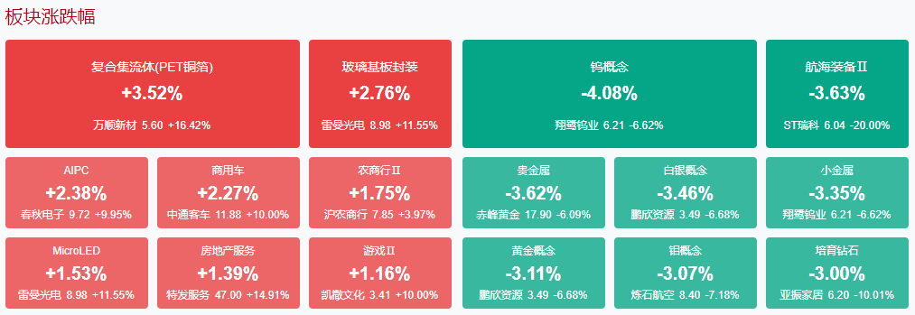 盘面上,玻璃基板概念股再度活跃,海目星、金瑞矿业、沃格光电涨停。铜箔概念股开盘大涨,英联股份涨停。AI PC概念股震荡反弹,英力股份、春秋电子涨停。猪肉股盘中拉升,正虹科技2连板。汽车整车股午后异动,中通客车涨停,江淮汽车涨超5%。下跌方面,黄金及有色概念股集体调整,湖南黄金等多股跌超5%。板块方面,铜箔、AI PC、汽车整车、猪肉等板块涨幅居前,黄金、民爆、军工、量子科技等板块跌幅居前。