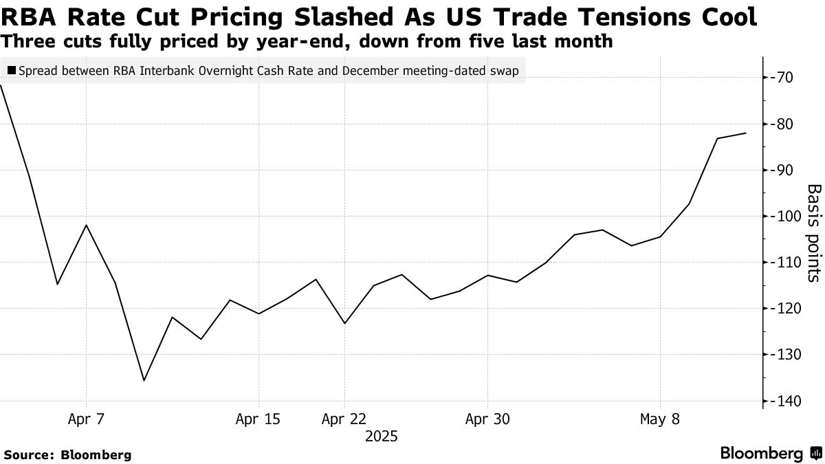 由于中美贸易紧张局势降温,交易员们正在撤回对澳洲联储将实施激进的货币宽松政策的押注。货币市场定价目前暗示,澳洲联储在今年剩余时间里只会降息三次。而就在四周前,当美国总统特朗普对贸易伙伴加征所谓“对等关税”导致全球经济增长前景蒙上阴影时,货币市场还预期澳洲联储今年剩余时间里将降息至少五次、且有第六次降息的可能性很大。