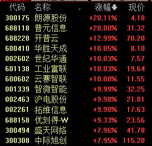 6月9月下午,云计算单边走强刷新日高,朗源股份、普元信息20cm涨停,工业富联、云赛智联涨停。今年以来,浪潮信息、深科技、拓尔思、同方股份涨幅均超100%。
