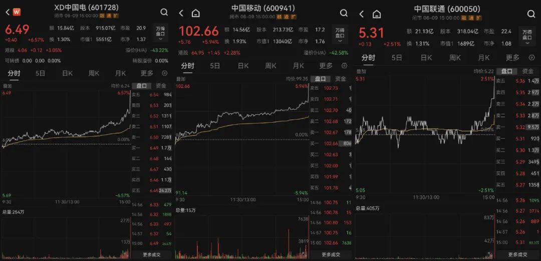 三大电信运营商尾盘异动,中国电信、中国移动、中国联通收盘集合竞价大幅拉升,中国电信大涨6.57%,竞价拉升涨幅近3%。