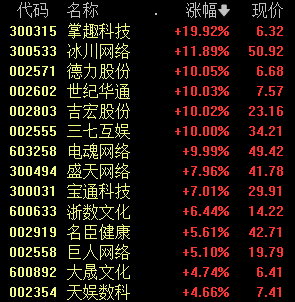三七互娱、吉宏股份涨停,掌趣科技大涨超19%,盛天网络、宝通科技、名臣健康等大涨超5%。